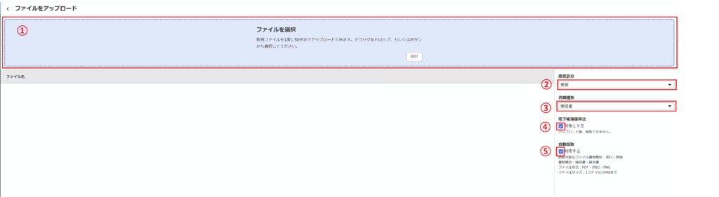 - ④「電子帳簿保存法の対象ファイルとする」にチェックを入れると、「電帳法区分」を選択できます。チェックを入れて電子帳簿保存法の対象とすると、アップロードしたファイルを削除できなくなります。