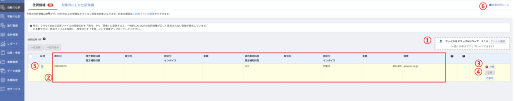 - ③上記②の仕訳候補で未入力や訂正が必要な場合は、この詳細ボタンより編集します。詳しくは下記4をご確認ください。