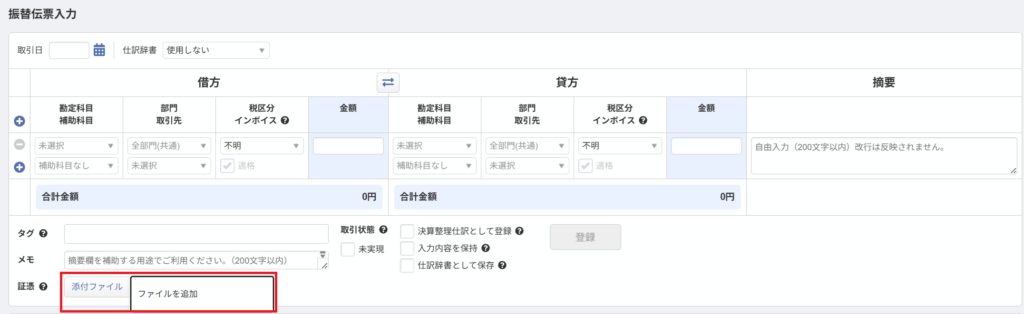 - 伝票入力の際に、「添付ファイル」をクリックし、「ファイルを追加」を開く。
