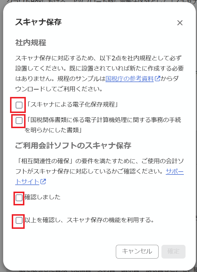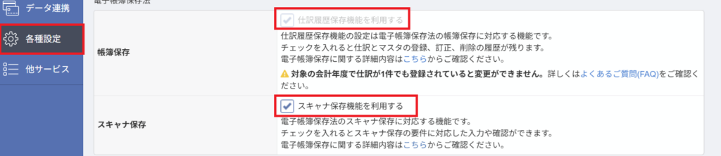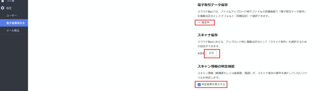 - 2. 「電子取引データ保存」と「スキャン情報の判定機能」にチェックが入っていることを確認。
