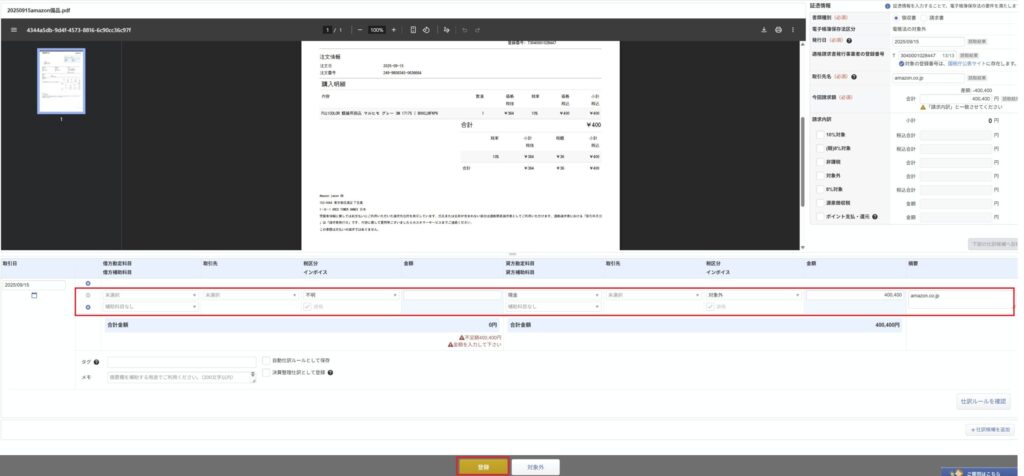- ④表示されている仕訳に問題がなければ、この登録ボタンから登録できます。