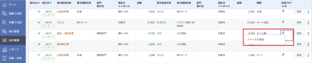 - 証憑を添付する仕訳の右側に表示されているクリップのアイコンをクリックし、「ファイルを追加」を開く。