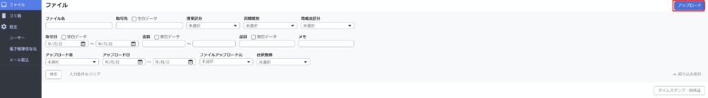 - 1.画面左のメニューから [ファイル] → 画面右上の[アップロード] を開く。