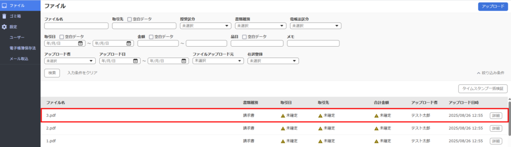 - 3.「ファイル」画面で「取引日」「取引先名」「金額」に「未確定」と表示されているファイルを選択します。