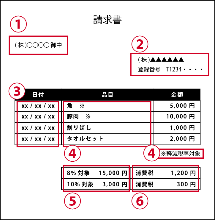 適格請求書として認められるために必要な主な項目は以下のとおりです。請求書フォーマットは取引先と合わせて運用してください。