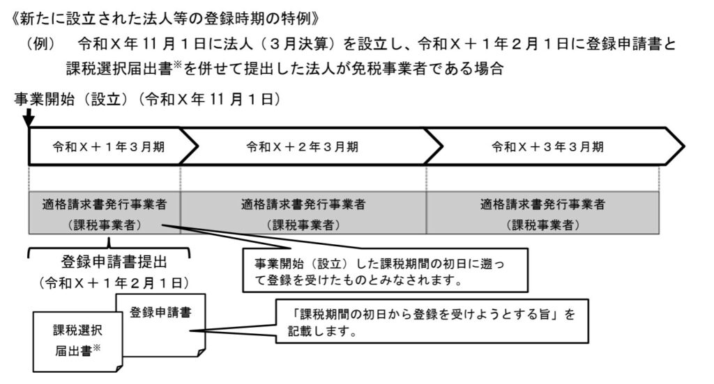新設法人・開業間もない個人事業主は、「事業を開始した日の属する課税期間の末日」までに登録申請をすれば、設立日から登録を受けたものとして扱われます。例えば下記の3月決算法人ならその年の3月31日までに登録申請を行えば設立日の11月1日から登録を受けたものとみなされます。
